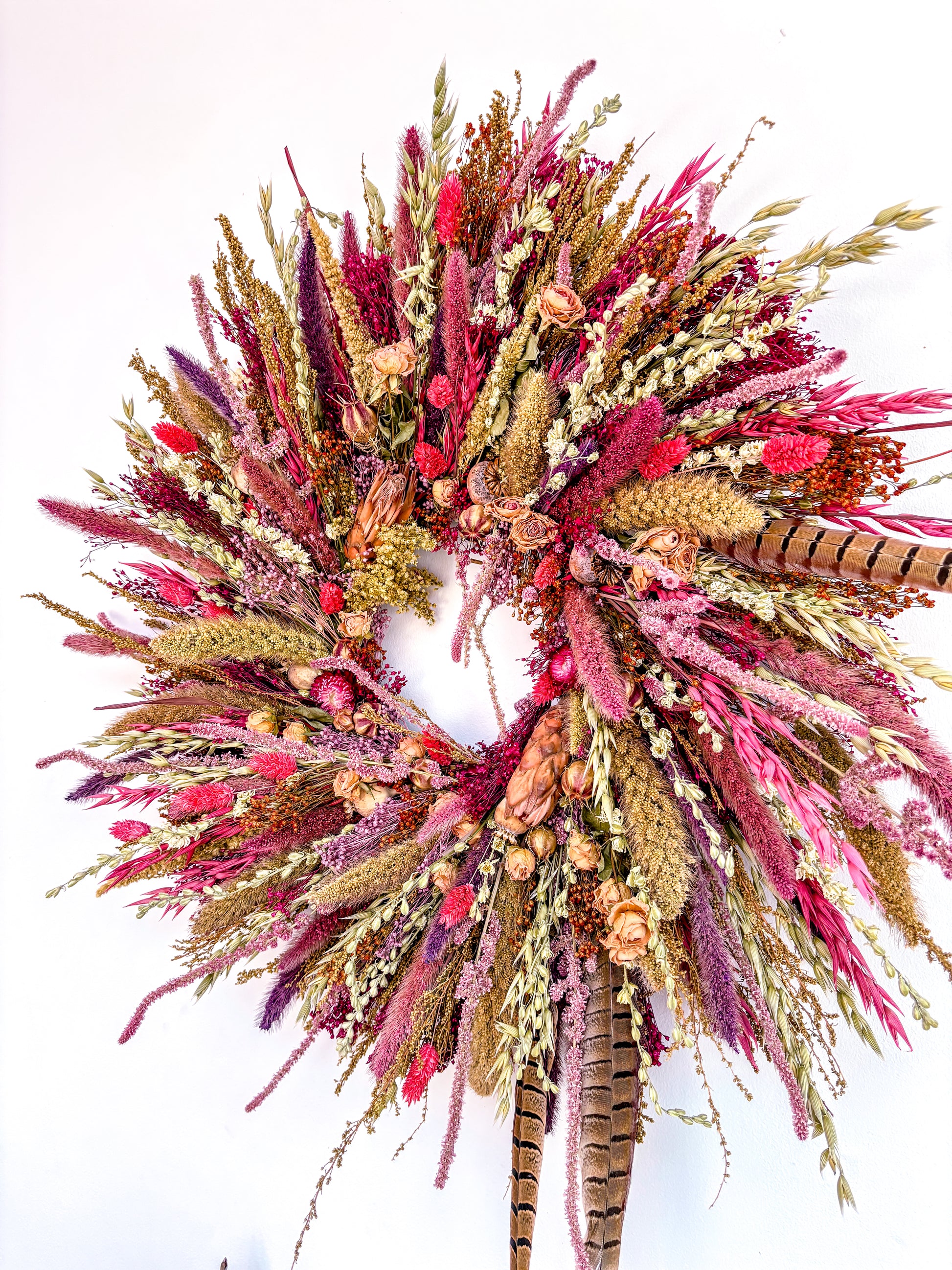Every wreath is one-of-a-kind, featuring a delightful mix of dried flowers and foliage. While the rich, bold hues of autumn remain consistent, the exact arrangement varies, offering a fresh surprise with every piece.